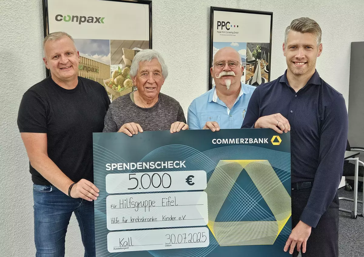 Tom Kantelberg (re., Geschäftsführer Papstar GmbH) und Bernd Born (li., Medien- und Marketingleiter) überreichten Greuel einen Scheck über 5000 Euro. "PAPSTAR ist stolz, die Hilfsgruppe unterstützen zu dürfen", meinte Bert Kantelberg, Vorstandsvorsitzender der PAPSTAR Holding AG.