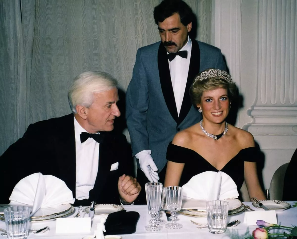 November 1987: Lady Di, die "Königin der Herzen", glänzt mit natürlichem Charme, Fröhlichkeit und einem legendären nachtblauen Samtkleid beim Dinner im Beethovensaal der Bad Godesberger Redoute. Dianas Tischherr ist Bundespräsident Richard Freiherr von Weizsäcker.