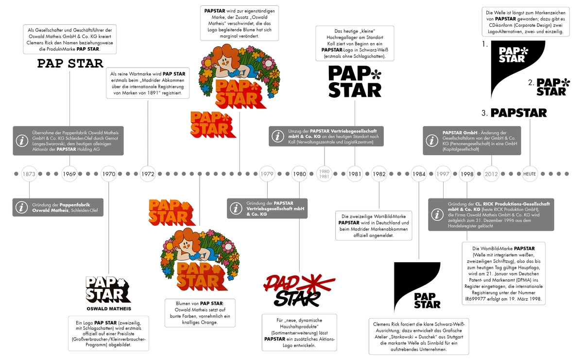 Das PAPSTAR-Logo im Wandel der Zeit (mit begleitender Unternehmensentwicklung; graue Hinweise) von 1873 beziehungsweise 1969 bis heute.