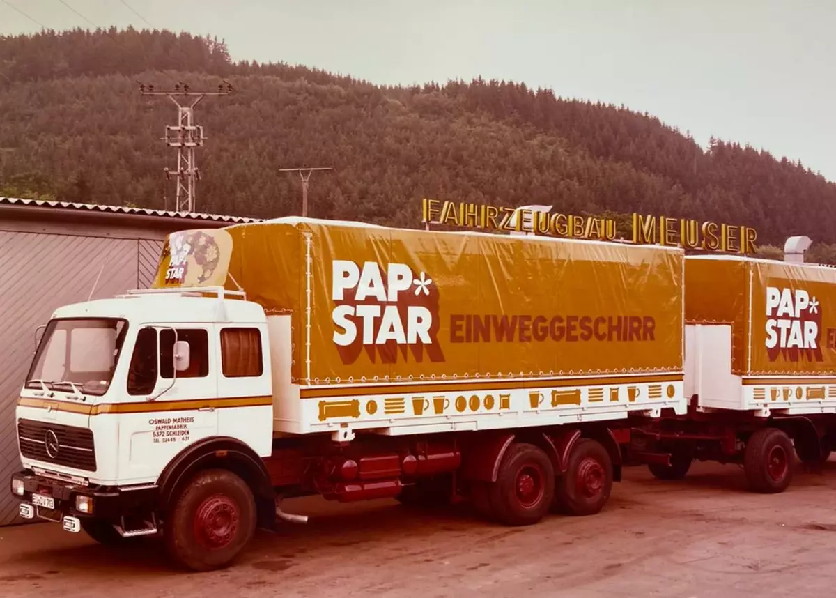 Aus wessen Feder das farbenfrohe PAPSTAR-Motiv stammt, lässt sich (noch) nicht exakt nachverfolgen. Wohl aber verdichten sich die Indizien, dass die damalige Offermann Werbegestaltung GmbH (Folienbeschriftungen) mit Sitz in Kall-Sistig entscheidend involviert gewesen sein muss. "Ich erinnere mich ganz genau und es lässt sich sogar mit etlichen Fotos dokumentieren, dass mein Vater Erwin sämtliche PAPSTAR-Lkw exakt zu dieser Zeit beschriftet hat", so Tochter Sandra Zenner, die den Betrieb nach dem Tod ihres Vaters noch bis 2007 weiterführte: "Als gelernter Schaufensterdekorateur hat er sich aus einer gewissen Monopolstellung in der Region heraus immer weiterentwickelt - und Logokreationen haben definitiv dazugehört."