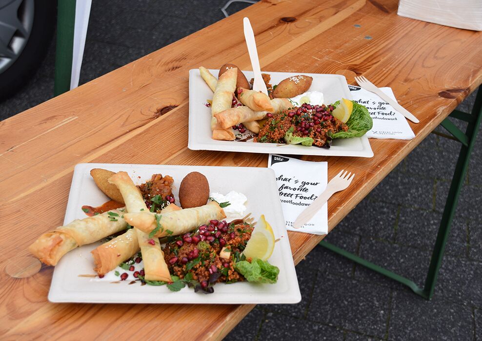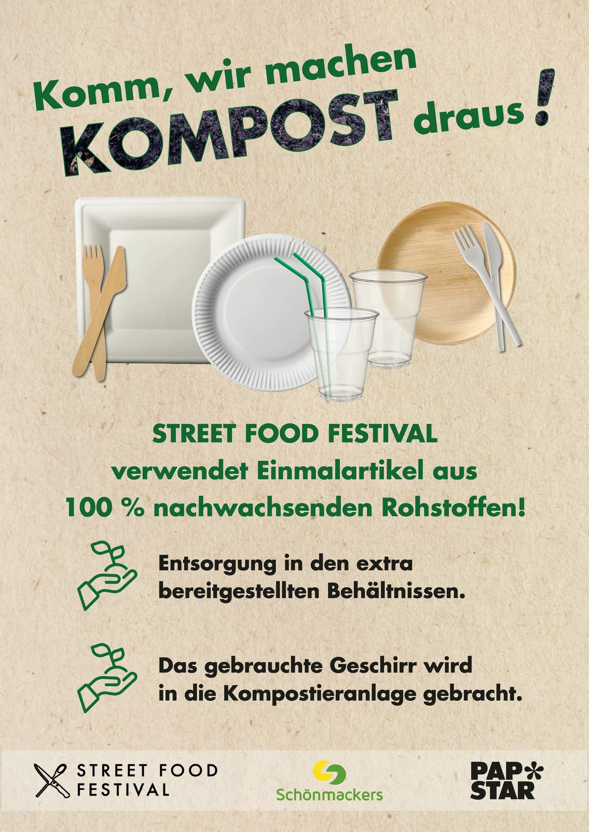 - Die beim Street Food Festival in Kleve verwendeten Einmalartikel sind ausschließlich aus nachwachsenden Rohstoffen wie Holz und Frischfaser-Karton, Palmblatt, Zuckerrohr oder Mais hergestellt.