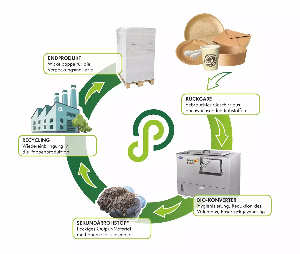 Durch den Einsatz eines Bio-Konverters wird eine Faseraufbereitung des gebrauchten Einmalgeschirrs erreicht. Der so gewonnene Sekundärrohstoff wird zu Pappe weiterverarbeitet, die in der Industrie zum Einsatz kommt. Um eine derartige Zirkularität in unterschiedlichen Anwendungssituationen zu ermöglichen, hat die PAPSTAR Solutions GmbH mehrere Kreislauflösungen in Abhängigkeit von der Materialart konzipiert.