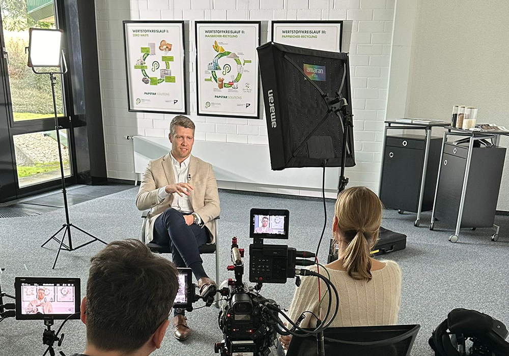 Hannah Koch, Chefin vom Dienst (CvD) und Autorin von TVT.Media, im Gespräch mit Tom Kantelberg, Managing Director der PAPSTAR GmbH: Auszüge des Interviews sind in der ntv-Reportage "Nix für die Tonne - Verpackungen von morgen" zu sehen.