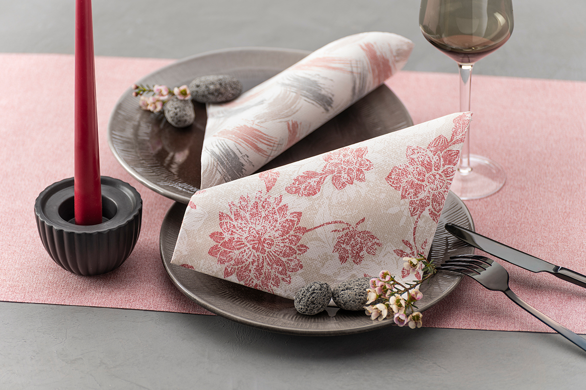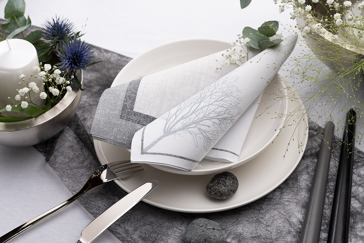 Auch bei der Bedruckung wird auf Feinheiten geachtet: Um den Hautkontakt gänzlich auszuschließen, wird die biologisch abbaubare Farbe - egal ob bei unifarbenen oder Dekor-Servietten - innenseitig aufgebracht. "Das hat zugleich den schönen Nebeneffekt, dass die Farbsättigung gleichermaßen elegant wie stilvoll wirkt", so Frank Kolvenbach: "Und gerade dieses zurückhaltende Design scheint bei den professionellen Großverbrauchern aus Hotellerie, Gastronomie, Café, Catering und Gemeinschaftsverpflegung richtig gut anzukommen."