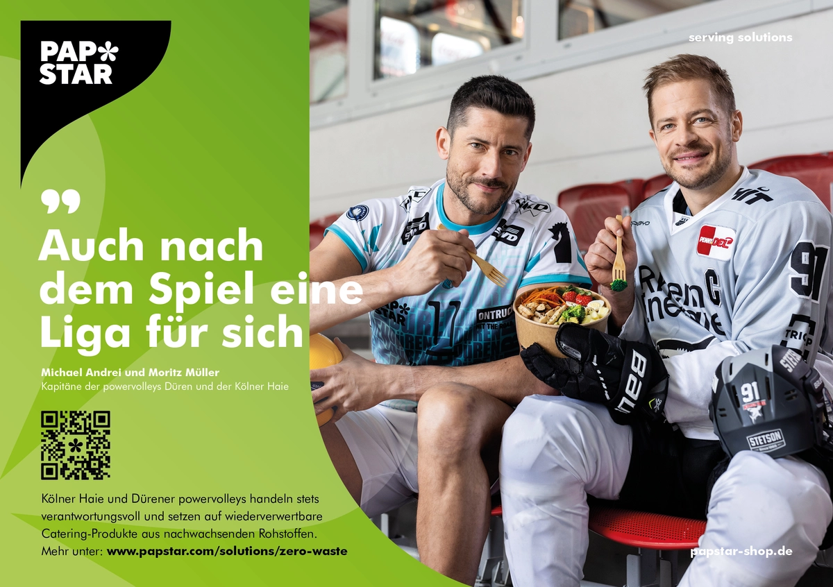 Ob Eisfläche oder Hallenboden: Sowohl die Kölner Haie als auch die SWD powervolleys Düren sind zurzeit sportlich recht ordentlich unterwegs, um auch außerhalb des Spielfelds verantwortungsbewusst voranzugehen. Beide Profiteams agieren nachhaltig und verwenden vor und nach dem Trainingsbetrieb sowie auf Reisen Catering-Produkte aus nachwachsenden Rohstoffen von PAPSTAR, die nach dem Gebrauch sortenrein eingesammelt und zu einem wiederverwertbaren Sekundärrohstoff aufbereitet werden.