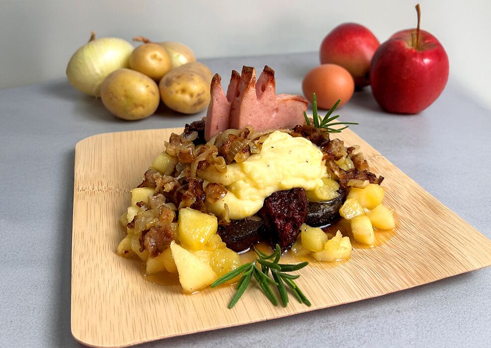 Typisch kölsche Gastlichkeit - "Himmel un Äd" met Flönz, dozo Leberkäs-Domtürmcher