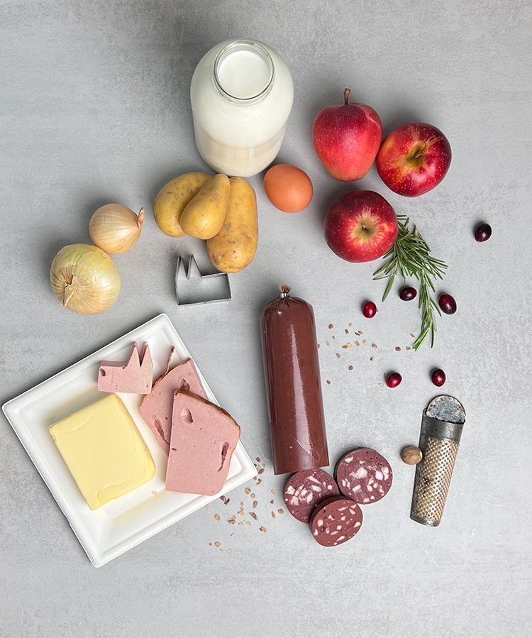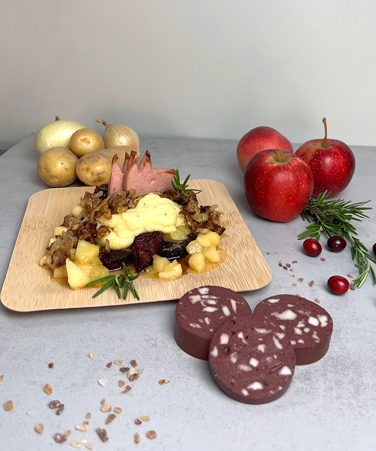 - Beilagen: gebatene Blutwurst und im Ofen angebackene, leicht angeröstete "Leberkäs-Domtürmcher"