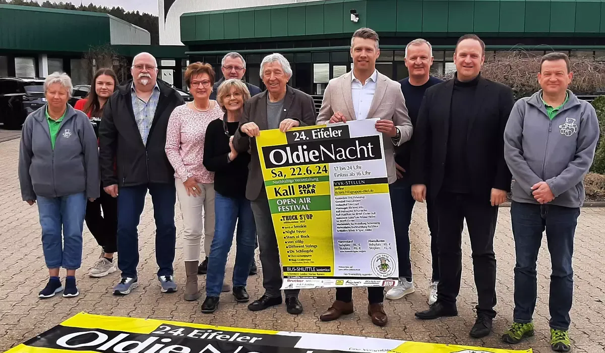 Freuen sich auf die 24. Oldie-Nacht am 22. Juni 2024 auf dem Unternehmensgelände von PAPSTAR (v. li. n. re.): Kerstin Tampier (Hilfsgruppe Eifel), Laura Möhrer (Gemeinde Kall), Rainer Suhr, Dagmar Poth, Ralf Heistert, Kathi und Willi Greuel (Hilfsgruppe Eifel), Tom Kantelberg, Bernd Born (PAPSTAR GmbH), Frank Kolvenbach (PAPSTAR Solutions GmbH) und Thomas Tampier von der Hilfsgruppe Eifel. (Foto: Reiner Züll)