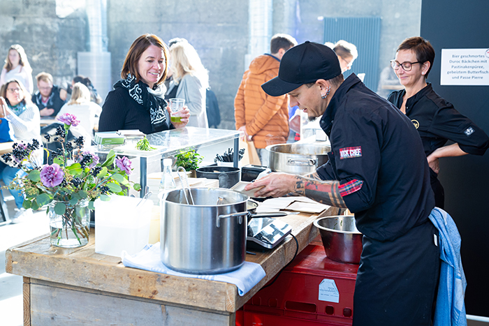 Das im Vorfeld mit den eat&STYLE-Machern von FLEET FOOD EVENTS um Lena Semmler, Stefanie Fritz und Kai Klemm vereinbarte Konzept ist demnach voll und ganz aufgegangen. Nicht zuletzt dank nahezu optimaler Voraussetzungen. So wurden die sechs Stadtmenüs in München fernab der eigentlichen "Flanier-Landschaft" (Zenith - Werkshalle für Konzerte und Events) gereicht; in der gegenüberliegenden stylischen Lokhalle war die Crème de la Crème der Münchner Gastro-Kunst sozusagen unter sich. Auf den rechteckigen PAPSTAR-Tellerchen wurden unfassbar leckere "Signature Dishs", sechs an der Zahl, zu jeweils erschwinglichen fünf Euro angerichtet und verkostet - vom "Crunchy Salmon Sushi" aus dem "Kim Sang" über ein Knödel-Trio von den "Gasthof-Neuwirt"-Küchenchefs bis hin zu Königlich-Kaiserlichen Kalbspflanzerl der Marke "Bamberger Haus".
