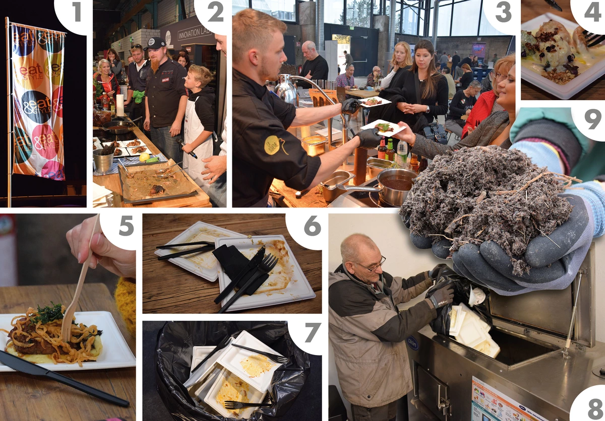 Unsere kleine (Münchner) Projekt-Bildergeschichte im "Schnelldurchlauf": eat&STYLE im Zenith und in der Lokhalle in München (1), PAPSTAR-Zuckerrohr-Tellerchen im Einsatz (2 und 3), perfekt angerichtete Stadtmenüs (4 und 5), gebrauchtes Geschirr - störstofffrei eingesammelt (6 und 7), "Komm, wir machen Kompost draus!" in die Tat umgesetzt (8 und 9). Das gleiche Procedere ist auch für die kommenden eat&STYLE-Events in Hamburg und Düsseldorf geplant. (Fotos: Bernd Born)